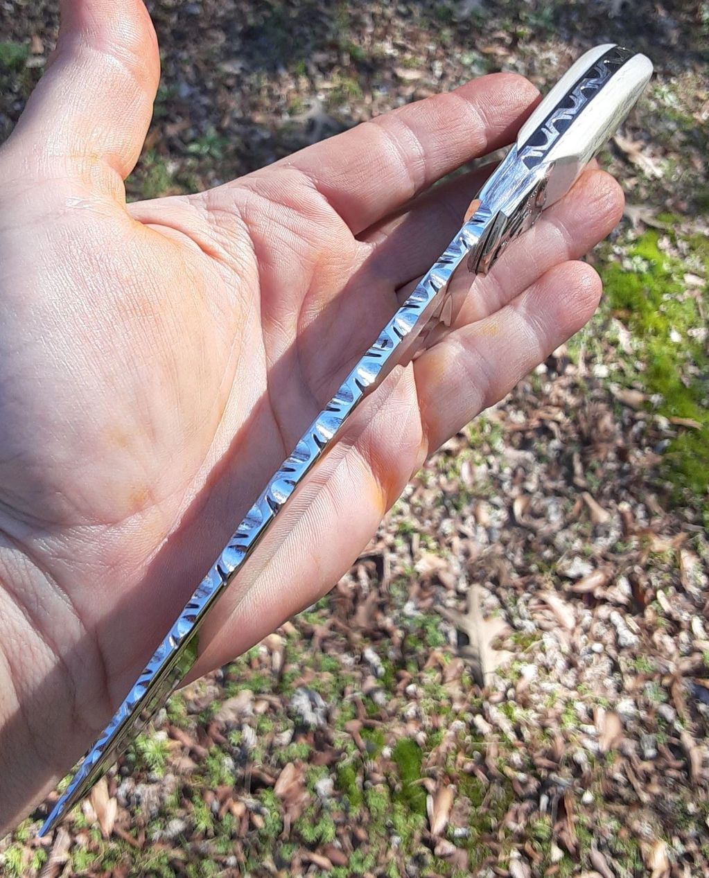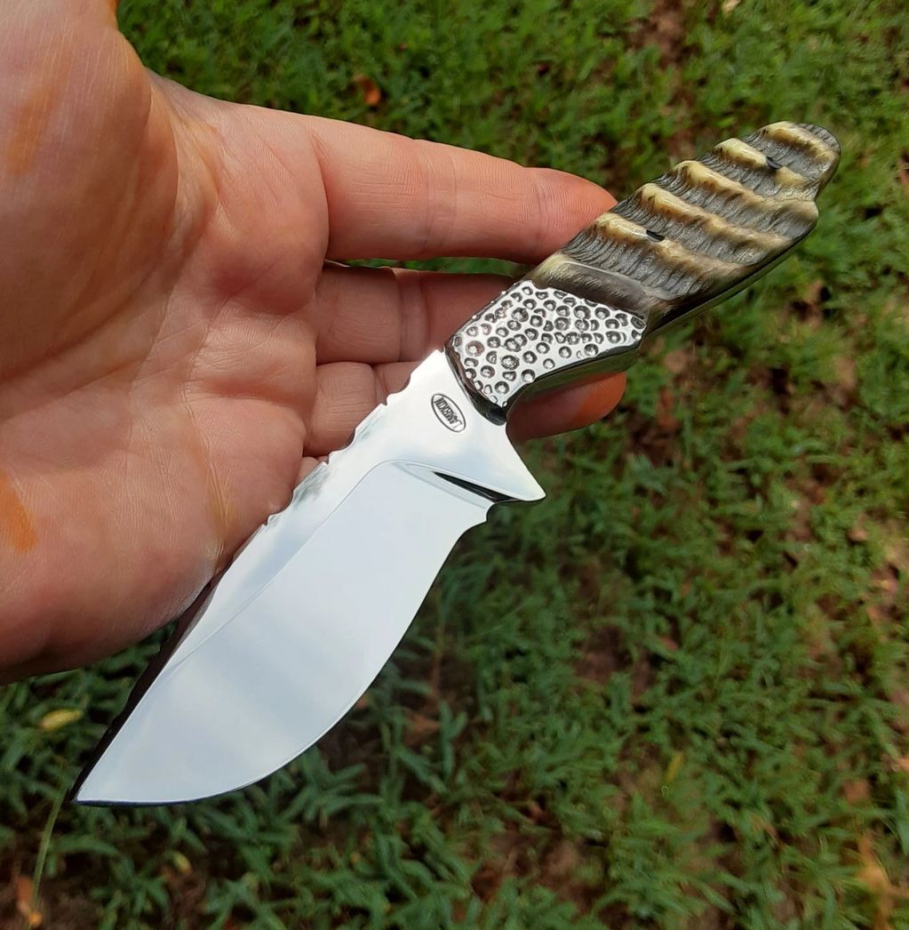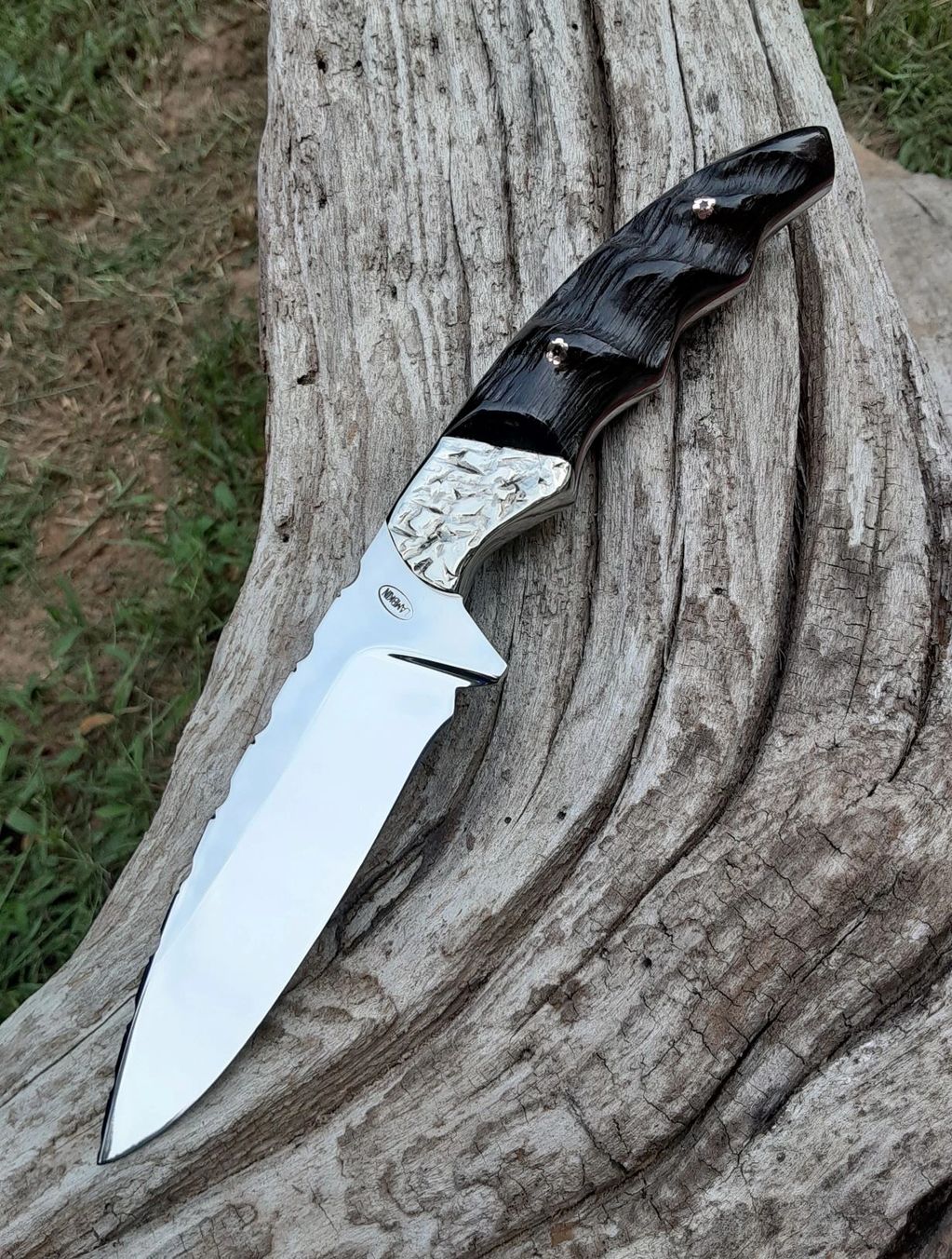 A high mirror polished CPM 154 blade holds a Superior Edge at 60-61 HRC! She has some Gnarly Waterbuck Horn handles and Hammered Stainless Bolsters!! Big grinds make Beautiful Mirrors!! Measures 6 1/2" OA with a 2 9/16" CE. Comes with a Custom Handmade Leather sheath.!!