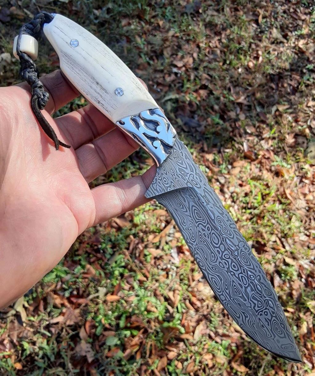 Hunter/EDC - Some gorgeous Giraffe Bone handles with Carbon Fiber bolsters! Alabama Damascus blade! 3 5/8" CE and 7 1/2" OA. Custom handmade leather sheath included. *****$650 shipped! - AVAILABLE!*****