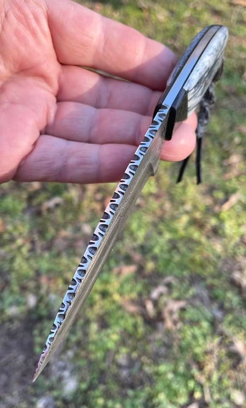 Hunter/EDC - Alabama Damascus blade with Waterbuck Horn handles! Filework over the blade! 3 1/4" CE and 7 1/4" OA. Custom handmade leather sheath included! *****$650 shipped. AVAILABLE!*****